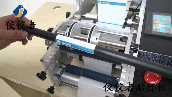 上圖展示的是工作人員將需要貼標(biāo)的PE管放在方便拿取的位置以增加貼標(biāo)的效率,此時(shí)有一個(gè)步驟在圖片中沒(méi)有展示出來(lái),那就是接通電源之后需要做的就是將PE管放在包膠軸與覆標(biāo)海綿軸待貼位置,可根據(jù)產(chǎn)品直徑的大小進(jìn)行調(diào)整,然后踩腳踏,此時(shí)貼標(biāo)過(guò)程已經(jīng)完成.看似只有一秒鐘的時(shí)間,在這個(gè)時(shí)間中,機(jī)器進(jìn)行了一系列的工作。當(dāng)腳踩發(fā)出信號(hào),電機(jī)轉(zhuǎn)動(dòng)帶動(dòng)PE管轉(zhuǎn)動(dòng),并送出標(biāo)簽到PE管上,一邊出標(biāo)一邊覆標(biāo).至此,貼標(biāo)過(guò)程就已經(jīng)完成了。(操作過(guò)程:放產(chǎn)品—>貼標(biāo)并覆標(biāo)(設(shè)備自動(dòng)實(shí)現(xiàn))—>取出已貼標(biāo)產(chǎn)品。)如下圖: