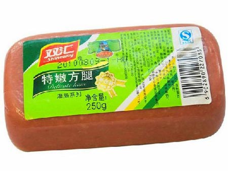 在標題上我說了,還有方形的。現在市場上方形的火腿腸也不少。能貼這個的機器也有。下面來看一下我公司的全自動平面貼標機對 方形火腿腸進行貼標的樣品圖片。