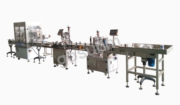 自動上瓶→自動灌裝→自動上蓋→自動旋蓋→自動貼標,其中旋蓋部分可設置兩個工位,分別適用噴霧瓶和普通瓶的旋蓋,使得一臺機器適用多種瓶型及瓶蓋,為客戶減少成本,產生最大效益。
